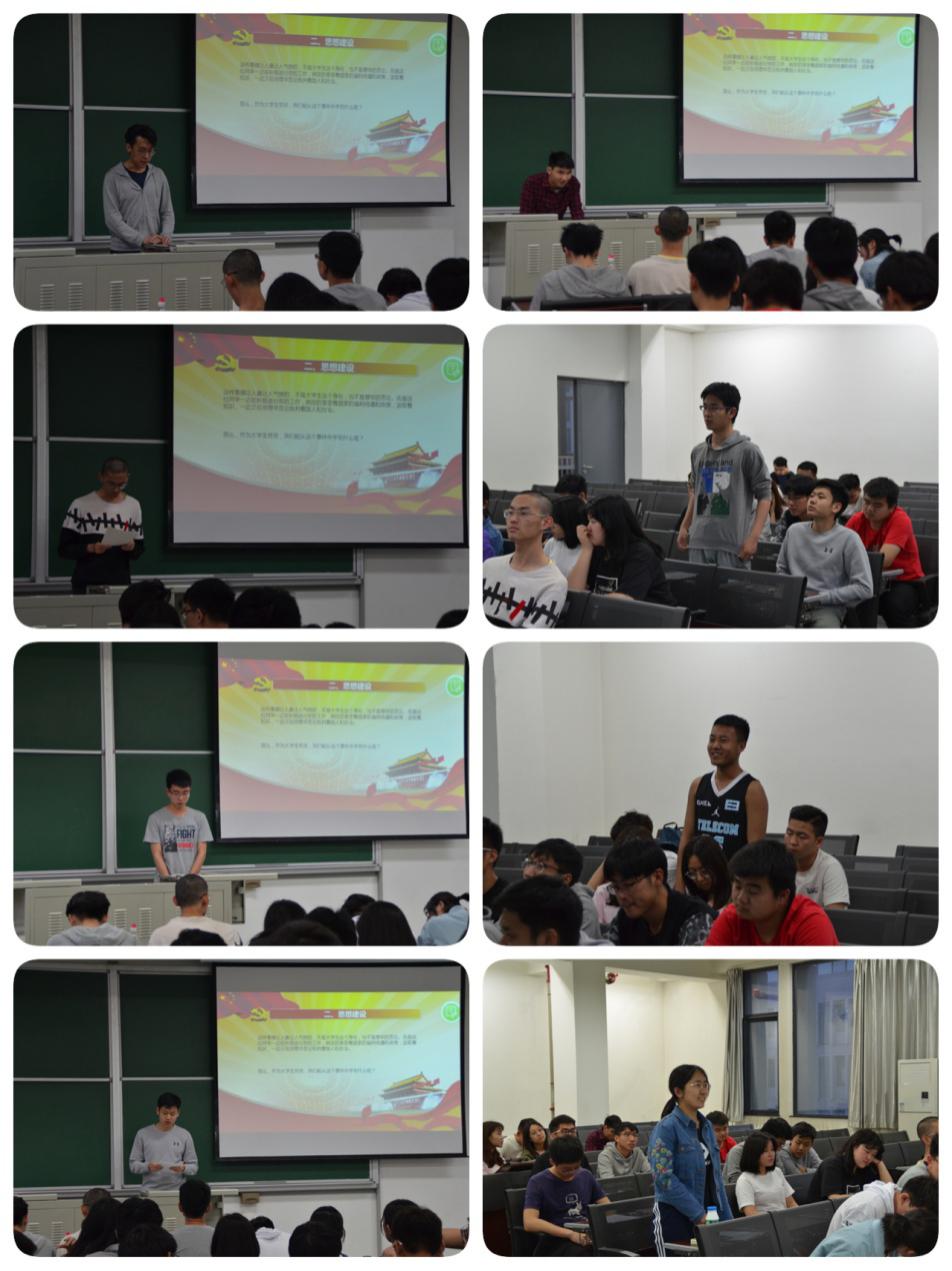 随后,与会党员依次上台发言。孙乐乐从社会主义核心价值观角度出发、白德民以新时代北建大学生党员应有的风貌为题、刘艳峰就“以德为先”的精神要求为指引,与大家交流以什么样的精神面貌和实际行动来践行党员义务;宫丛澄、王杰则以一个民族、国家的精神追求结合自身经历来谈论如何在思想学习中发挥示范引领作用,如何在班级和宿舍中发挥先锋模范带头作用。现场学员积极加入讨论并发表看法。