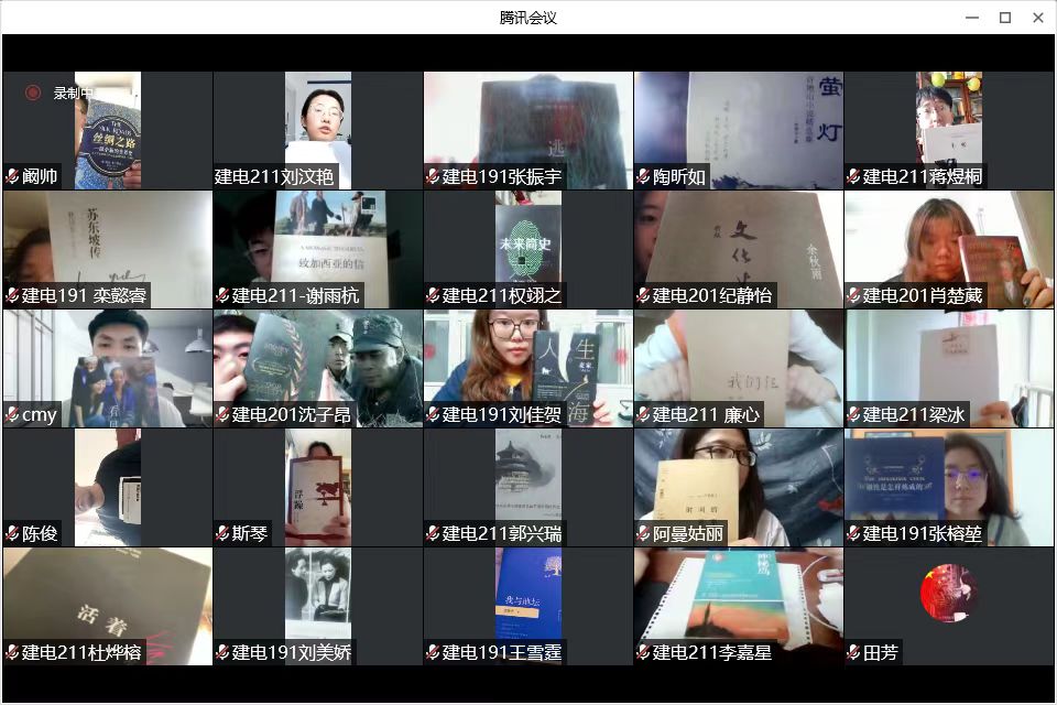 随后,同屏视频展示一本自己正在读的书,并为自己制定阅读计划环节,大家纷纷打开摄像头,自豪地展示手中的书籍,还有的同学互相推荐,主动介绍,很是有爱。