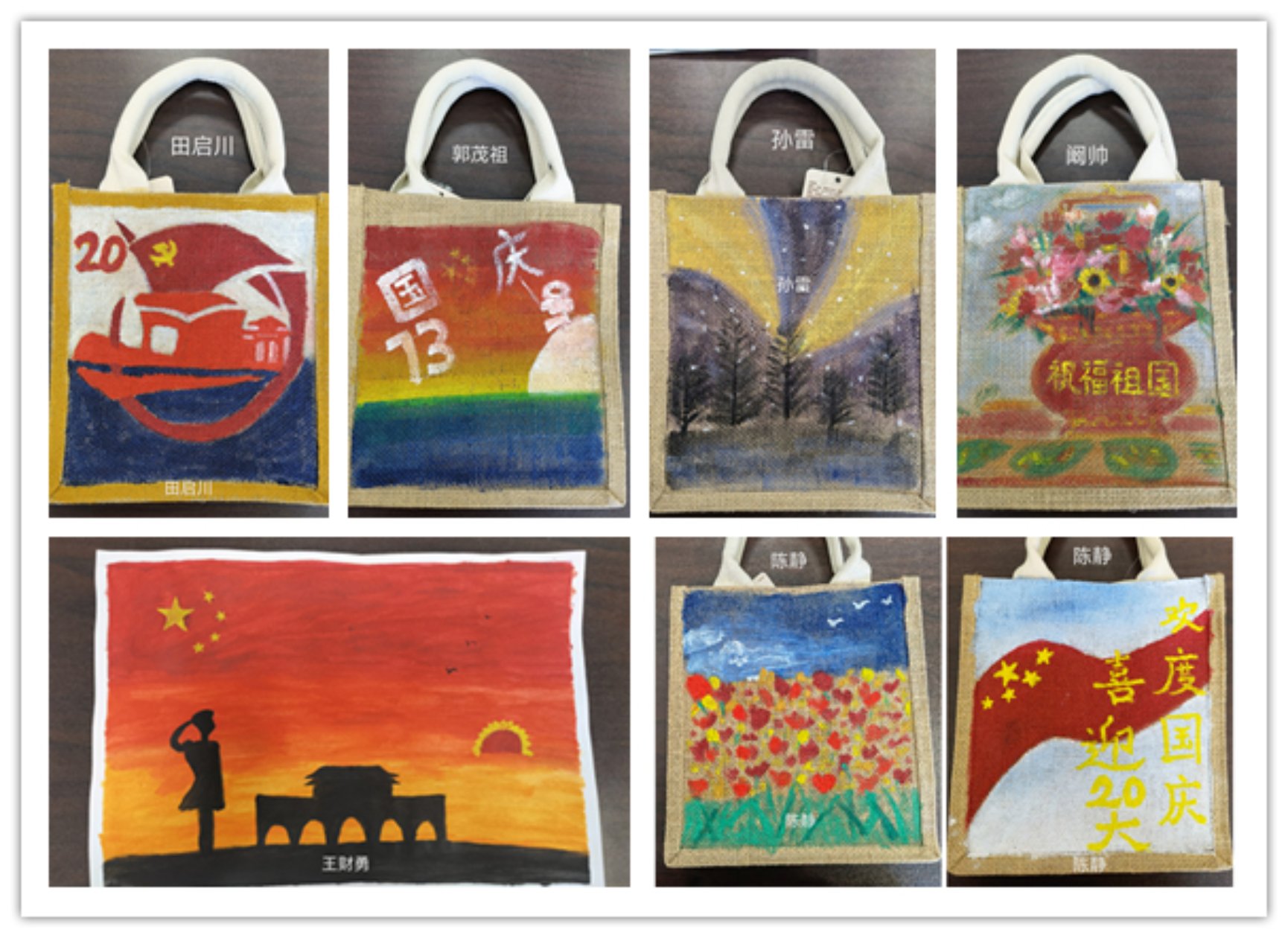 老师们发挥自己的创意,在手袋上涂画出美丽的风景、可爱的人物、鲜红的国旗党旗,绘出了对祖国的深情,对未来的美好憧憬。