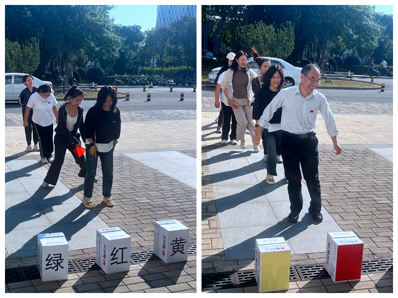 培训前还开展了“挑战红黄绿”团建活动,裁判随机喊出“红黄绿”口号,小组长们站成一排,根据口令跳到相应颜色的赛道。活动既考验了反应能力也锻炼了体力,大家的玩的意犹未尽。