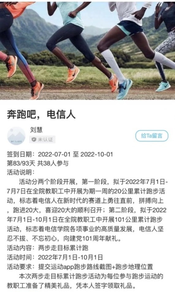 为进一步激励教职工奋进新时代、展现新作为,电信扑克王下载 分工会于2022年7月至9月组织开展了“奔跑吧,电信人!”主题活动。活动分两个阶段开展:第一阶段以完成20公里累计跑步为目标,寓意喜迎二十大顺利召开;第二阶段以完成101公里累计跑步为目标,寓意献礼建党101周年。