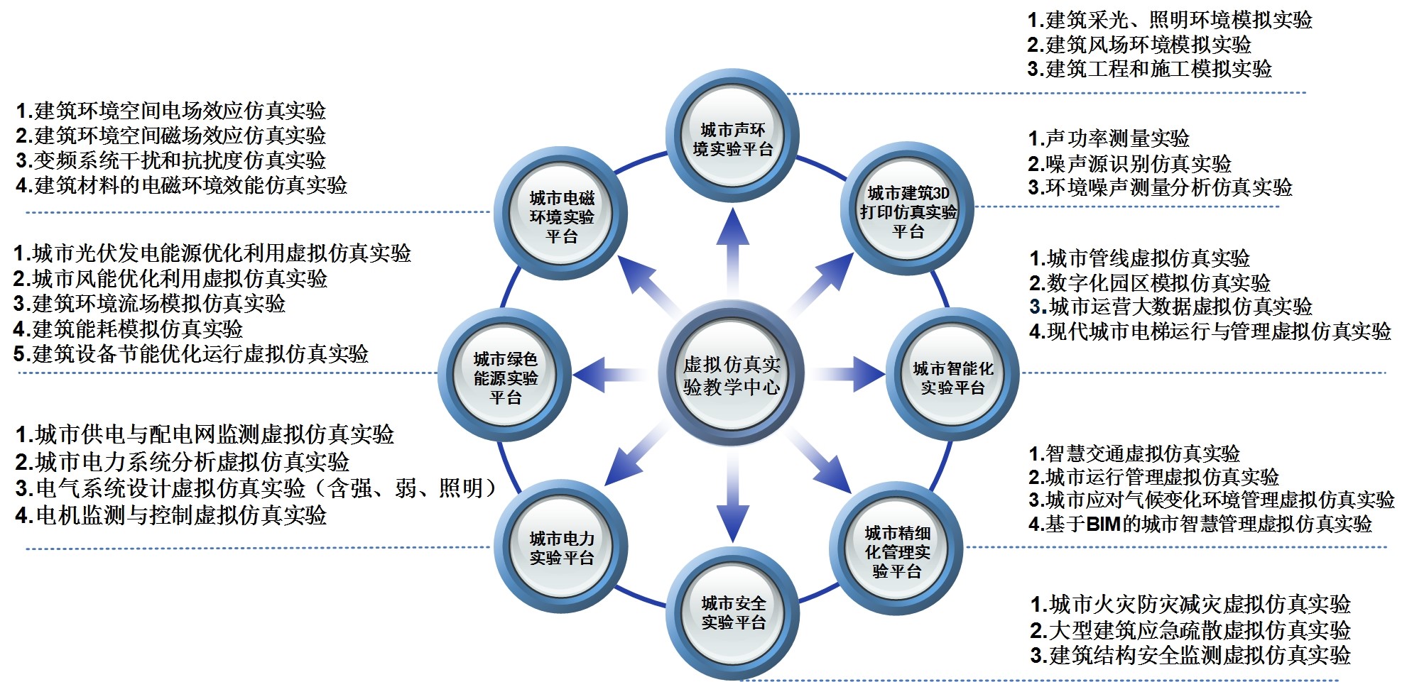 中心经过持续建设,目前已形成了跨学科、跨院系,以“智慧城市智能化建设、运营与管理”为特色的虚拟仿真实验教学系统,以解决北京城市发展建设与城市运行管理的突出问题为主要目标,对城市建设与管理整个过程所涉及到的相关专业知识进行系统分类,架构了8类实验教学平台,以适应与满足地方城市建设高速发展的特殊需求。8类实验平台包括城市智能化、城市精细化管理、城市安全、城市电力、城市绿色能源、城市电磁环境、城市声环境和城市建筑3D打印仿真,依托这8个实验平台,自主研发了25个虚拟仿真实验系统,设置了30个实验模块,开设了117个虚拟仿真或半实物模拟仿真实验项目,用于为本校25个本科专业、8个硕士一级学科和11所兄弟院校相关专业,以及相关企事业单位开展实验和实训教学,同时面向全校学生开设通识教育实验模块。