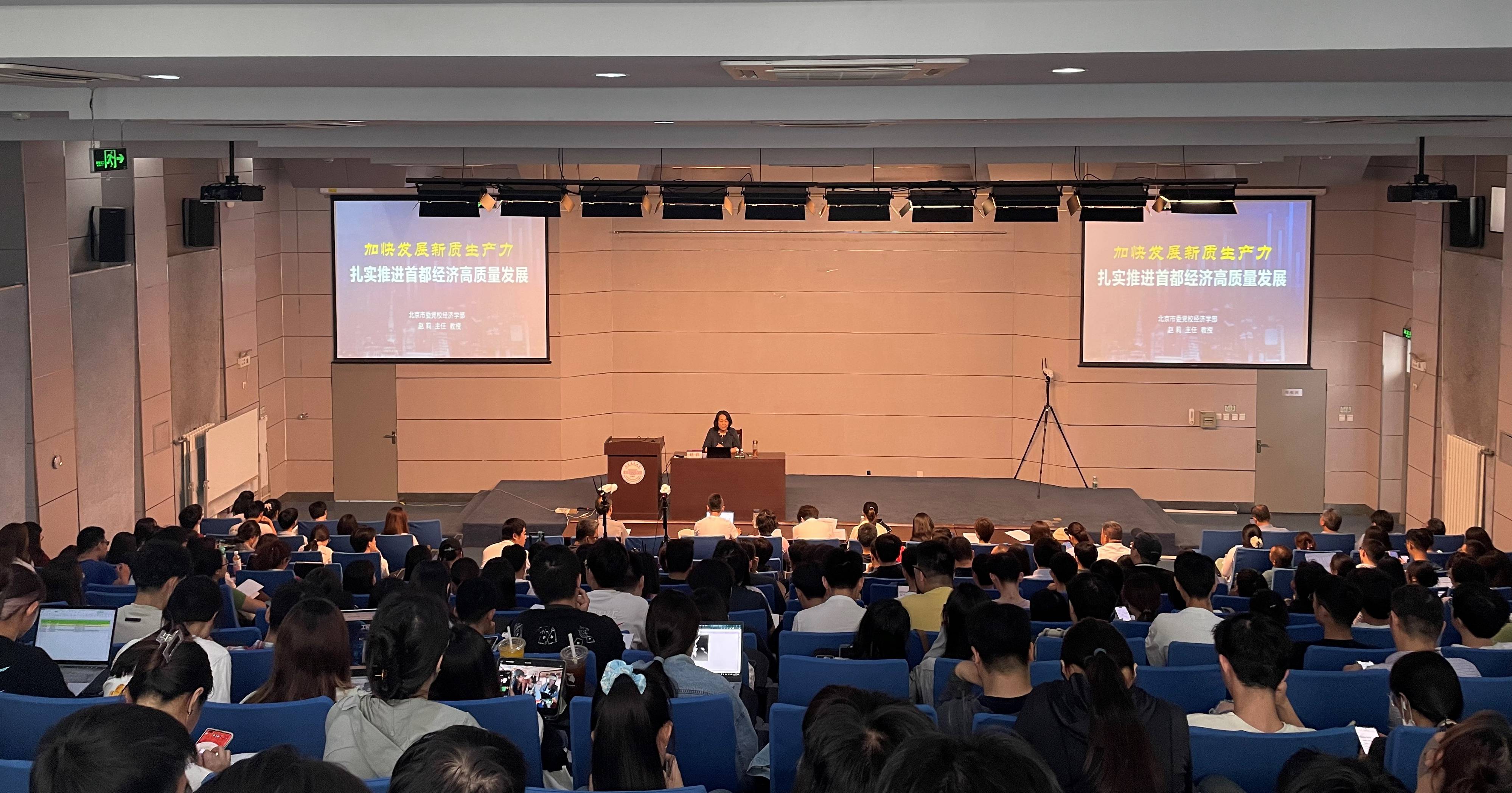 赵莉教授以《加快发展新质生产力 扎实推进首都经济高质量发展》为题,从中国式现代化、高质量发展、新质生产力之间的内在逻辑,新质生产力的理论内涵与实践要求,推进首都经济高质量发展的着力点三个方面,对什么是新质生产力、新质生产力国际发展趋势和国内发展现状、如何科学把握新质生产力与新型生产关系的内在联系、为什么加快发展新质生产力是实现中国式现代化的重要推动力等问题进行深入阐释。同时,授课结合2024年北京市政府工作报告提出的重点任务,通过分析目标、挑战、举措,深入浅出地讲解为何发展新质生产力是推动首都高质量发展的内在要求和重要着力点。