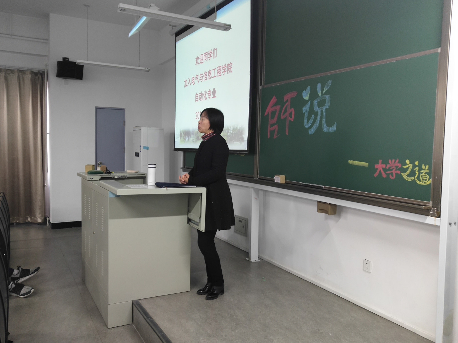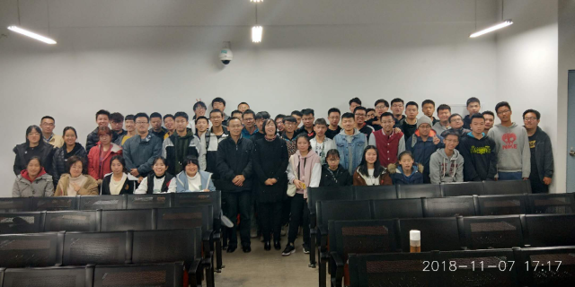 谭老师最后希望同学们:“身为大学生,应该学习,但这种学习不应该是痛苦的,而应该是痛并快乐着。”强调了学习的重要性与必要性,应该摒弃生活中的恶习,做优秀的大学生,过有意义的大学生活。可见两位老师对自动化的新生们抱有很高的期望!最后2018级自动化全体学生与两位老师合影留念。