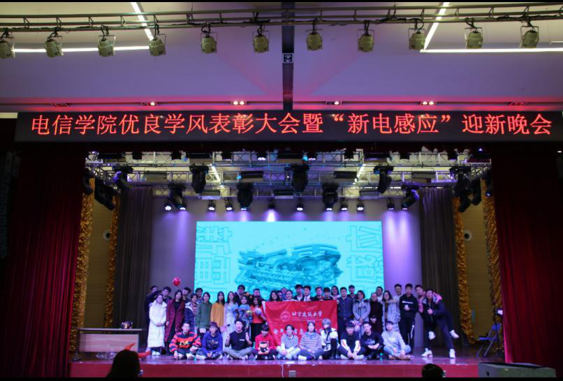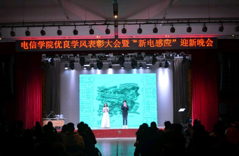 2018年12月11日晚6:30,电信扑克王下载 优良学风表彰大会暨“新电感应”迎新晚会在大兴校区大学生活动中心如期举办。电信扑克王下载 院长助理王晓辉老师,分团委书记田奔老师,文法扑克王下载 分团委书记代云老师,辅导员翟玮、高静、王景民老师,学工部干事排孜古·努尔依克木老师出席晚会,晚会由张宇彤和吴博文两位同学主持。