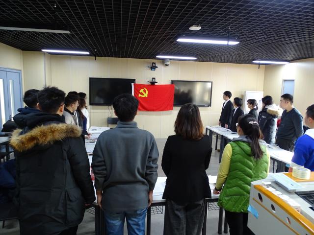 会议伊始,全体起立,面向党旗,奏唱国际歌。