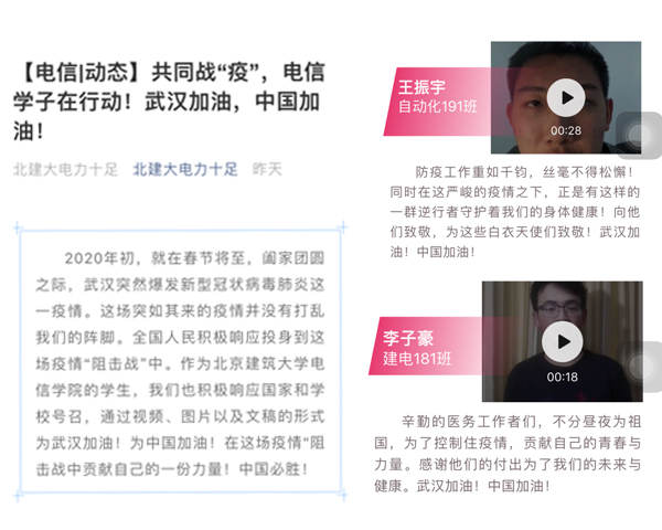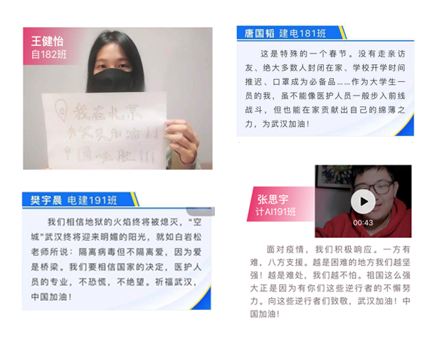 党委精心组织宣传,通过“北建大电力十足”公众号以“共同战‘疫’,电信学子在行动”为专题进行网络推送,号召电信学子通过实际行动以视频、图片以及文稿的形式为武汉加油!为中国加油!积极在这场疫情“阻击战”中贡献自己的一份青春力量!