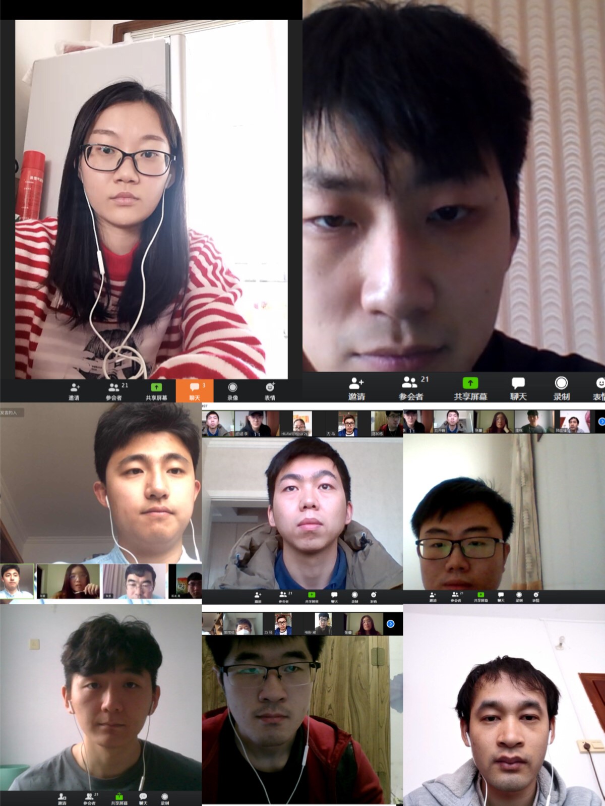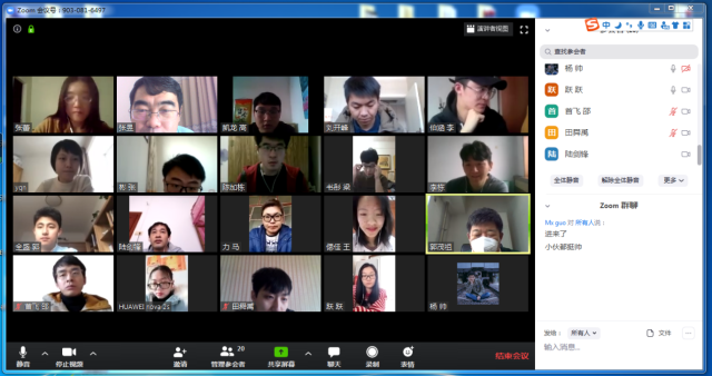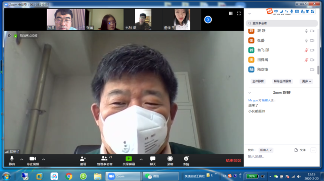 2020年2月20日12:10分,电信扑克王下载 部分教师和研究生利用Zoom软件召开了一次网络视频会议。参加会议的有电信扑克王下载 院长郭茂祖教授、张蕾、张昱、隋栋老师,以及各位老师的博士研究生、硕士研究生,共计21人。