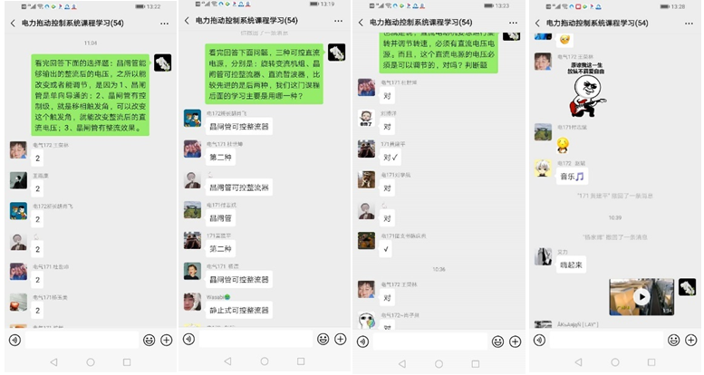我主讲的大三核心专业课程,“电力拖动控制系统A”,准时按照课表时间上午3、4节,在线上课。我从早晨7点零8 分左右进入到手机上的学习通,还算顺利,但当时钟走到7点52分时,手机学习通已经爆堵,由于我只是占坑,长时间没有发布活动,我被踢出学习通,后来到了9点43分,我以顽强的点击率冲破拥堵的学习通入口,重新占领了学习通阵地,以最快速度发布“投票”指令,让学生签到,但是仅仅维持了13分钟,学习通已经瘫痪了,任凭如何点击手机都无济于事。此刻容不得片刻犹豫,我带领电17级全体学生转战到微信课程群里,用群主身份向全体学生发布号令,利用我上周就已经录制好的5段速课,依次发送给学生。学生都很配合,全部第一时间到课程微信群里报到、接受教师的在线授课。每次播放完一段速课,我都以答题方式了解学生是否听懂速课内容了?是否学透了?学生们都很认真,看完速课都能在第一时间以抢答的方式回答我的提问,还用各种表情包与老师互动,表示他们学的很开心。我分别采取简答题、判断题、选择题等形式,在每次学生在线学完速课内容后把问题抛给学生,每次都有机灵的学生很快就能正确回答这些提问,而我每次都会及时回应并鼓励学生继续学习。