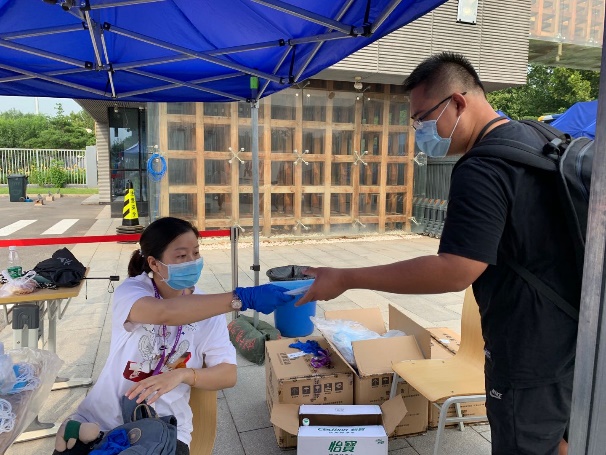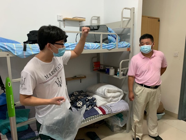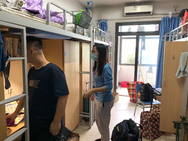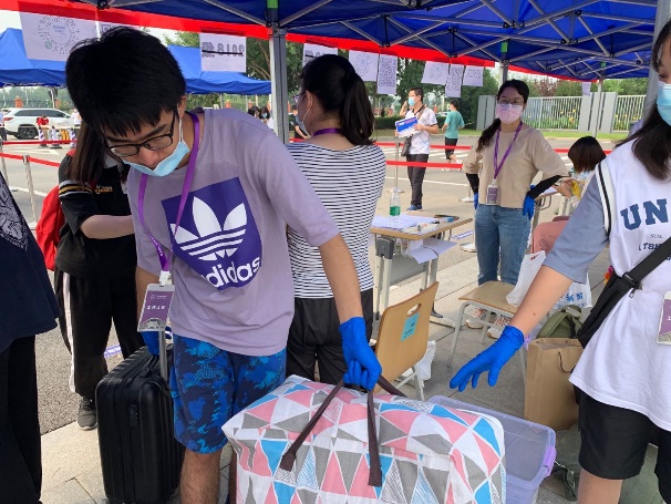 部分到的早的学生入校后,放下行李,甚至来不及收拾,就立即穿上志愿者的背心,作为返校工作志愿者协助同学搬运行李,协助老师们发放物资。