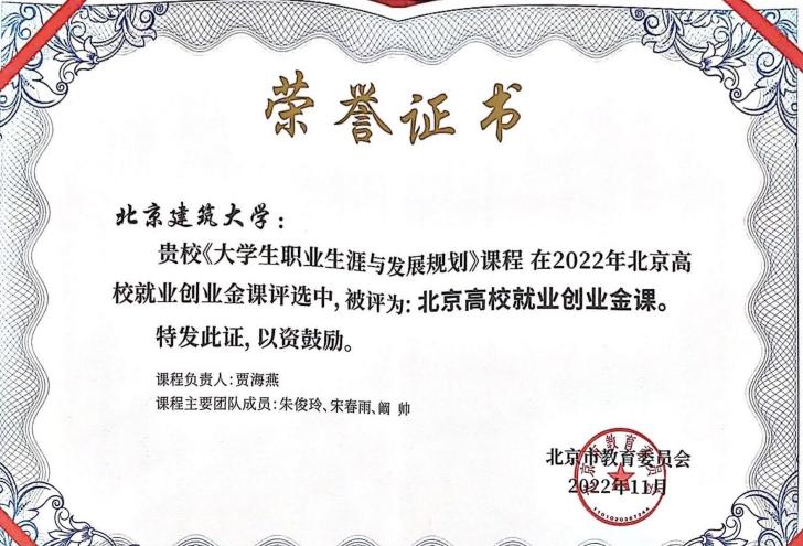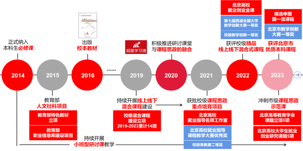 本课程先后出版教育部就业指导特色教材(2015),入选教育部就业创业典型案例(2020),获批北京高校就业指导名师工作室,课程思政重点培育项目(2021),首批入选北京高校就业创业指导金课,校精品线上线下混合式课程(2022),获批教育部全国高校毕业生就业能力培训基地,获评北京市优质本科课程(2023)。教育部学生服务与素质发展中心领导来校调研就业指导课程建设情况,给予高度肯定。