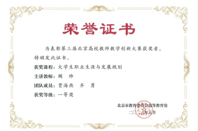 团队负责人担任十三五规划教材副主编、参编《大学生职业生涯规划与就业指导》等教材2部;获西浦全国大学教学创新大赛一等奖、北京高校教师教学创新大赛一等奖、北京高校就业指导课程教学大赛优秀奖;作为支部书记所在党支部获评全国党建工作样板支部,多次获评首都社会实践先进工作者。团队核心骨干成员贾海燕老师现为北京高校就业指导金课负责人,北京高校就业指导名师工作室负责人;团队中齐勇教师获评北京市优秀德育工作者、优秀党务工作者。教学团队承担教育部思政课题1项、北京市思政课题11项,发表核心期刊思政论文7篇,实现了教学相长。