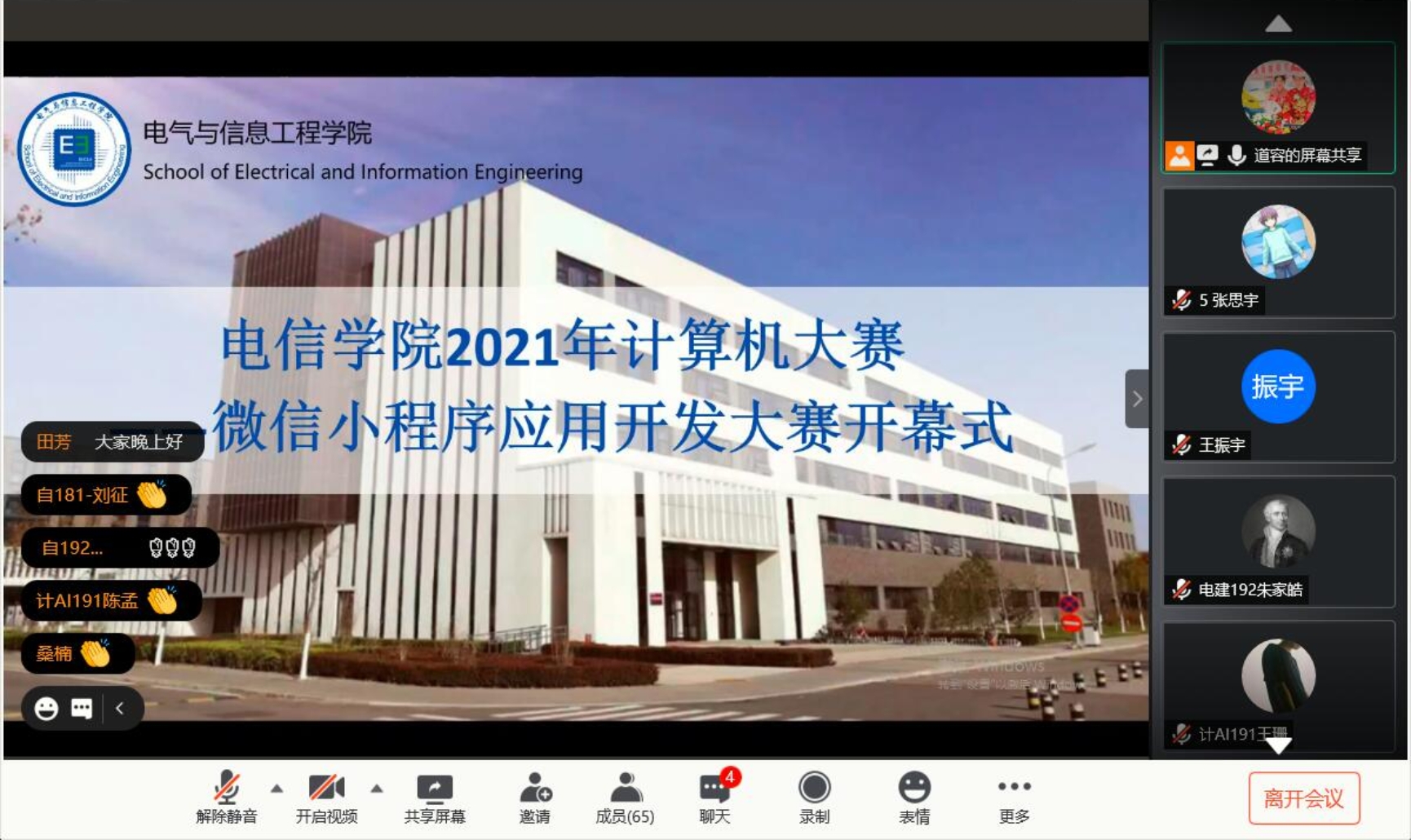 2021年1月16日,电信扑克王下载 微信小程序应用开发大赛开幕式在线上成功举行。扑克王下载 党委副书记田芳、团委书记阚帅、计算机专业老师钱丽萍出席本次开幕式,开幕式由电信扑克王下载 2019级辅导员胡道容老师主持。开幕式围绕赛事背景介绍、扑克王下载 寄语、专业教师动员、经验分享、竞赛规则解读五个方面开展。