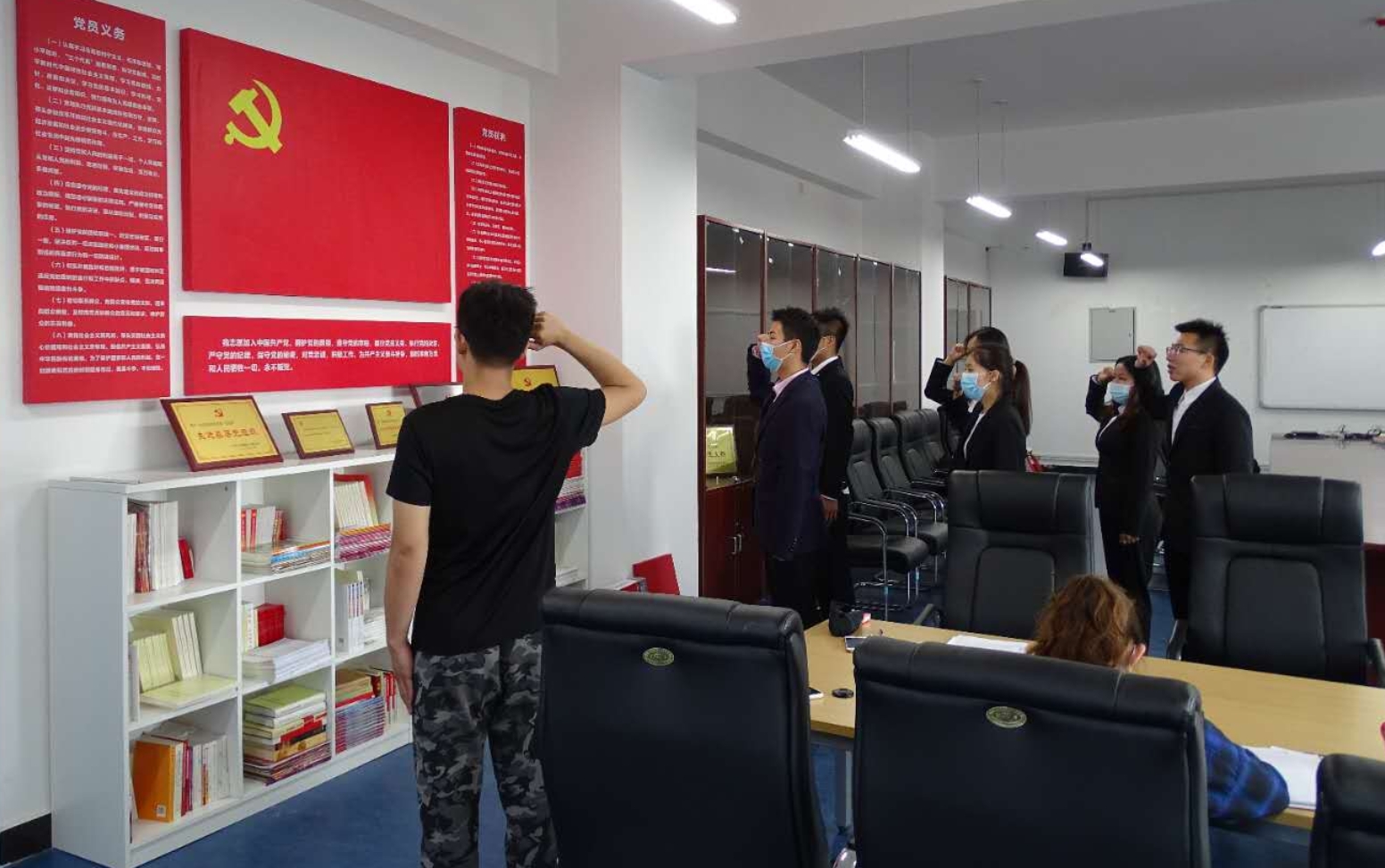 陈林林等六名同学在党旗下庄严宣誓,表示会在今后的学习工作中,坚定目标、严格要求自身,努力改正现有不足,不忘初心跟党走,积极向优秀共产党员学习,用实际行动来践行自己的入党誓言,使自己无愧于中共党员这一光荣称号。