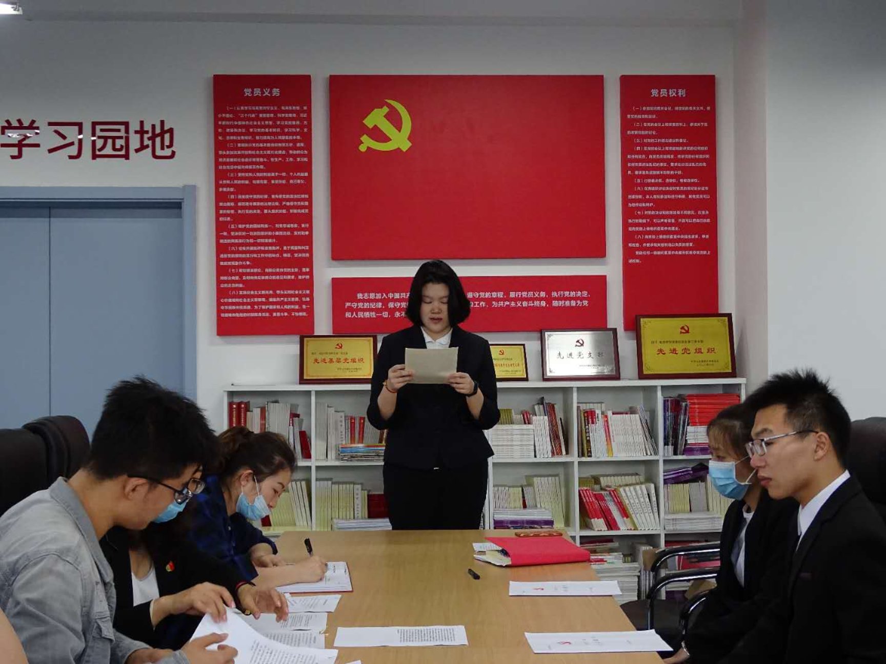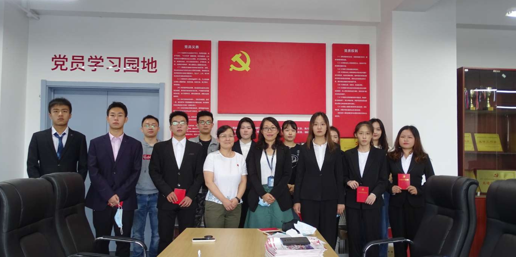 之后,陈林林等六名同学依次宣读入党志愿书,马建民同志宣读发展对象的函调情况、入党介绍人对发展对象在考察期间思想政治、学习、生活、发挥作用等方面的表现情况进行介绍,与会人员对几位的表现充分发表意见后,经正式党员以无记名投票方式进行表决后一致通过陈林林等六名同学的入党申请,师洪洪宣读关于接收陈林林等六名同学成为中共预备党员的决议并为他们发放党章。