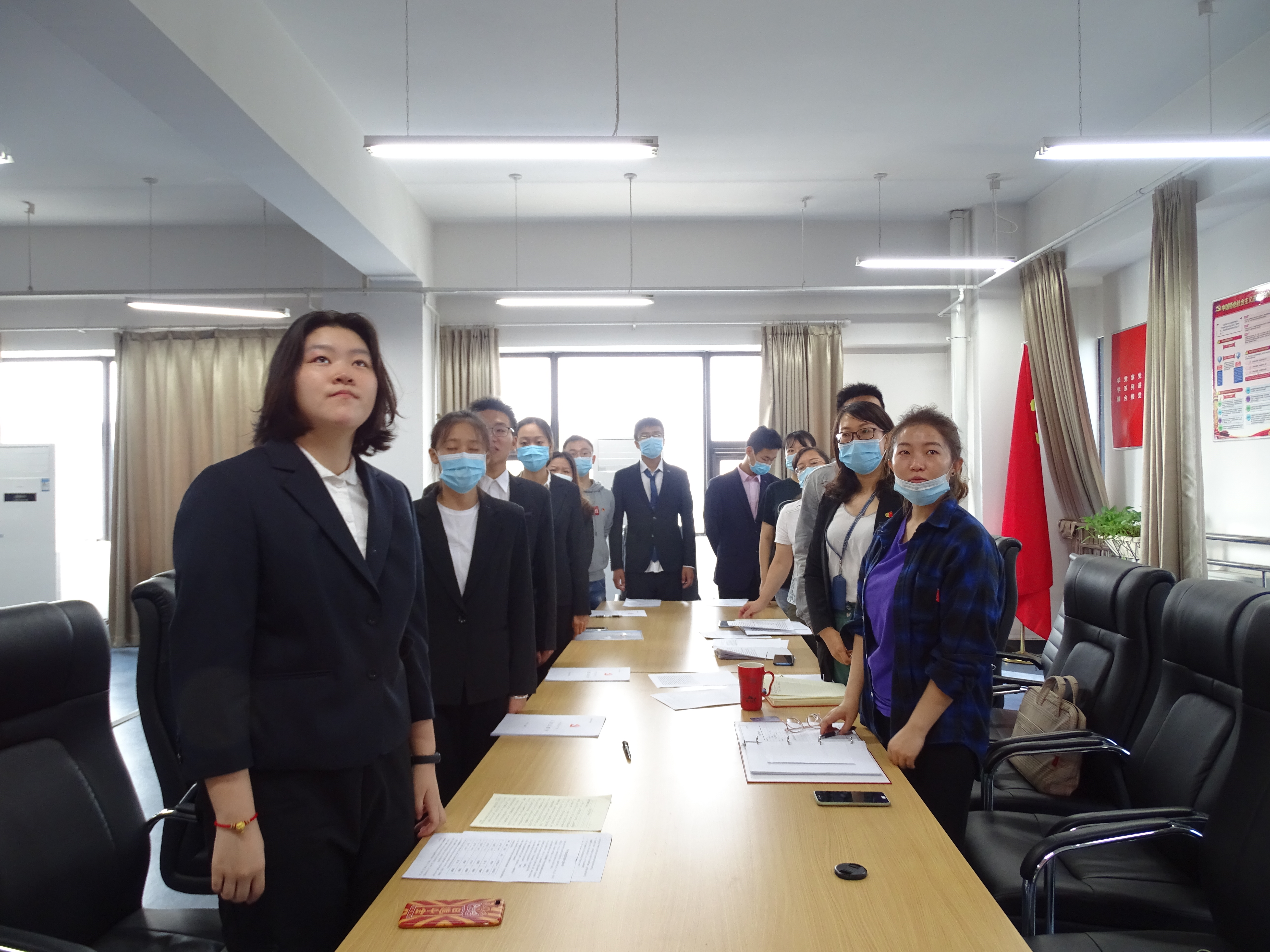 会议伊始,全体起立,面向党旗,奏唱国际歌。