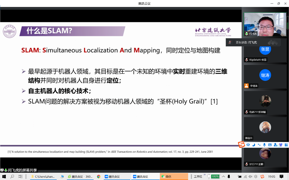 为促进扑克王下载 的学术交流,开阔学生学术视野,2022年5月17日19点,电信扑克王下载 城市计算与人工智能研究室特别邀请闫飞虎博士,作了题为“浅谈视觉SLAM”的学术讲座。讲座通过腾讯会议进行。电信扑克王下载 副院长魏东教授、院长助理田乐老师、人工智能系副主任赵光哲老师、计算机系副主任刘亚姝老师等和博士研究生、硕士研究生、本科生近百人参加了本次讲座。讲座由城市计算与人工智能研究室主任张昱主持。