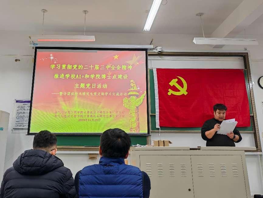 为学习贯彻党的二十届三中全会精神,推进学校AI+和扑克王下载 博士点建设,计算机技术研究生第一、第二党支部于11月29日联合开展主题党日活动暨计算机技术研究生学术交流活动。活动由第二党支部书记段然主持。扑克王下载 党委副书记秦岭和组织员丁建峰列席参加本次活动。