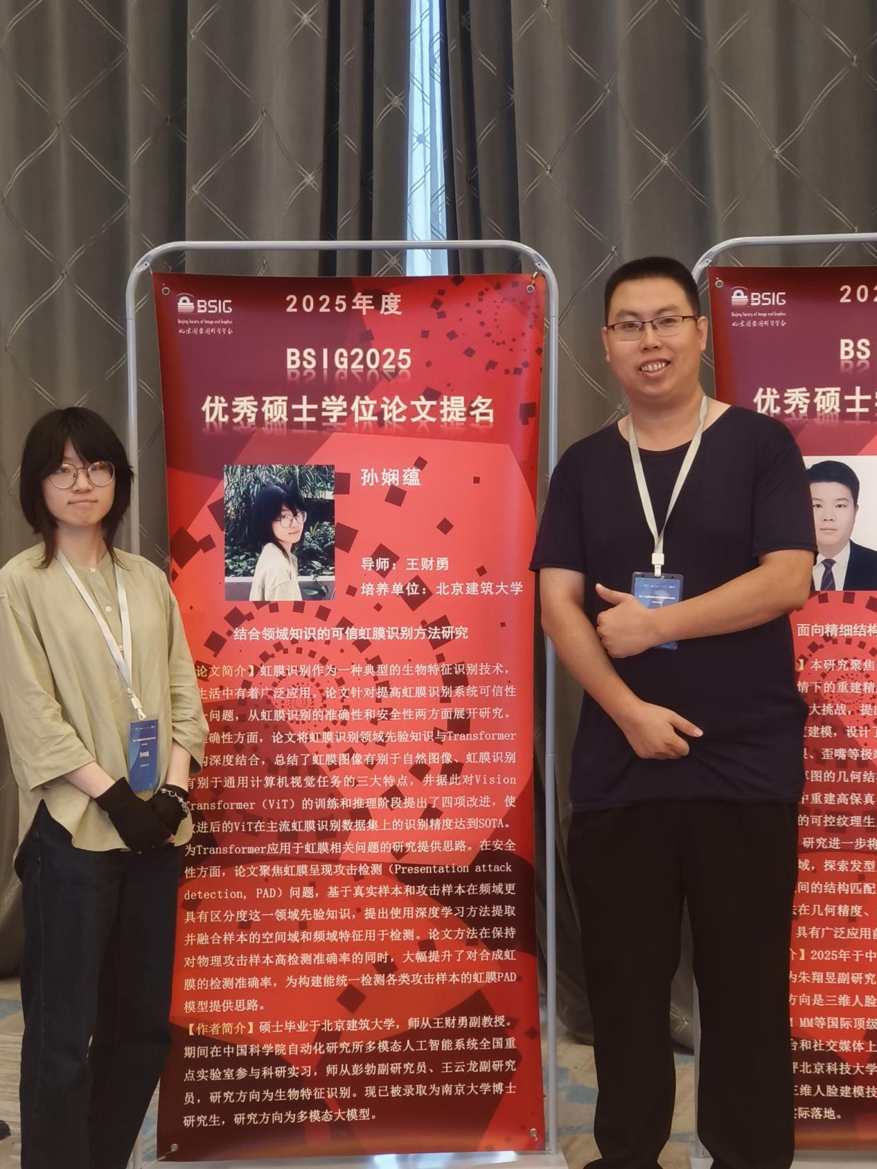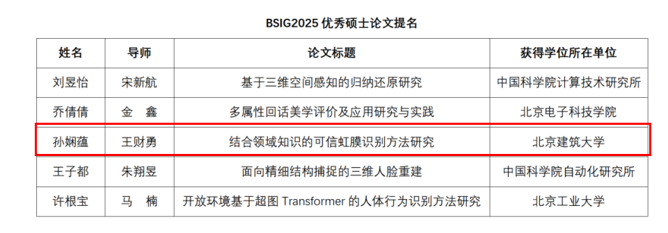 2025年8月9日,在北京召开的第二十届图像图形技术与应用学术会议(IGTA2025)上获悉,扑克王下载-扑克王app 智科扑克王下载 王财勇副教授指导的2025届研究生孙娴蕴同学的硕士学位论文《结合领域知识的可信虹膜识别方法研究》获得2025年北京图象图形学学会(BSIG2025)优秀硕士论文提名奖。
