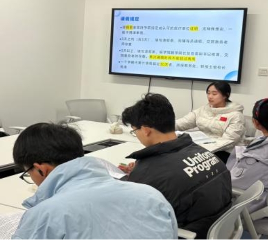 团队建立“负责人一学委”双周培训例会机制,形成“高年级带动、全年级覆盖”的常态化培训体系。负责人轮流牵头,开展系统化、实务化培训,内容涵盖学业修读、课程考核、学位授予、推免政策、绩点计算及考场纪律等关键政策,逐步构建全员、全过程、全方位的学业支持网络。