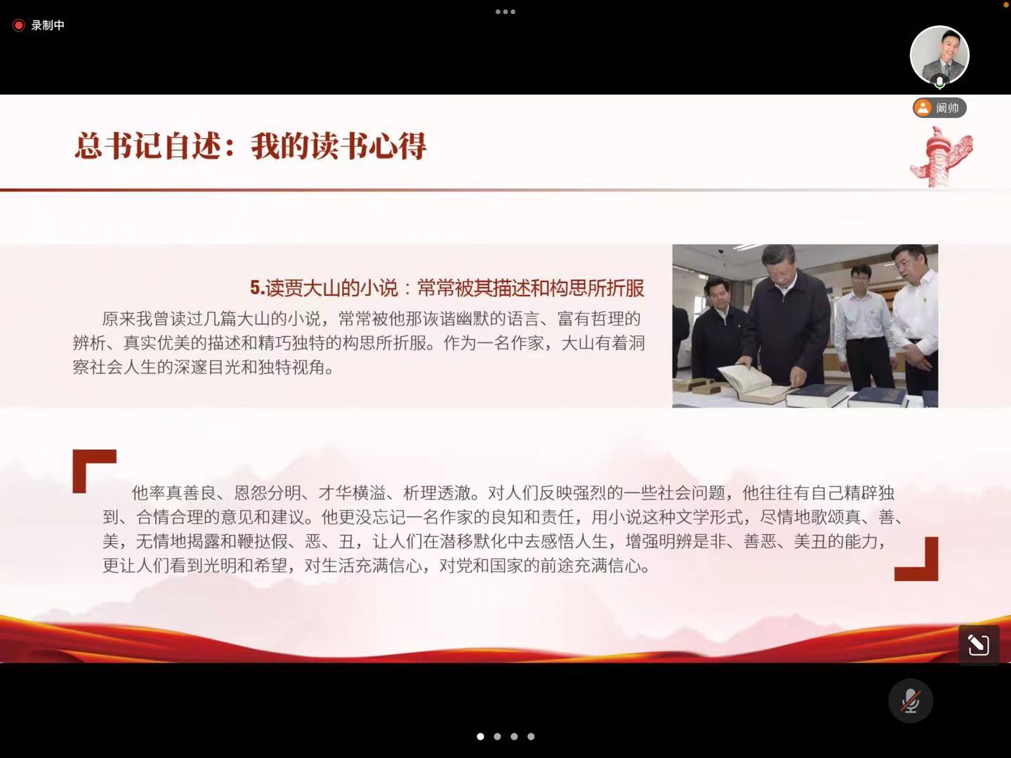 全体师生党员、积极分子、入党申请人一同学习习近平总书记的读书心得。“读书,我终身的爱好。”听总书记分享他的读书故事,参与学习活动的师生倍受感动。“在学习历史知识的时候,要坚持马克思主义的历史观和方法论,不能读死书,要同工作实际结合起来,对所读之书要取其精华、去其糟粕,做到‘博学之,审问之,慎思之,明辨之,笃行之’。”总书记的谆谆教诲犹在耳边,青年师生倍受鼓舞。