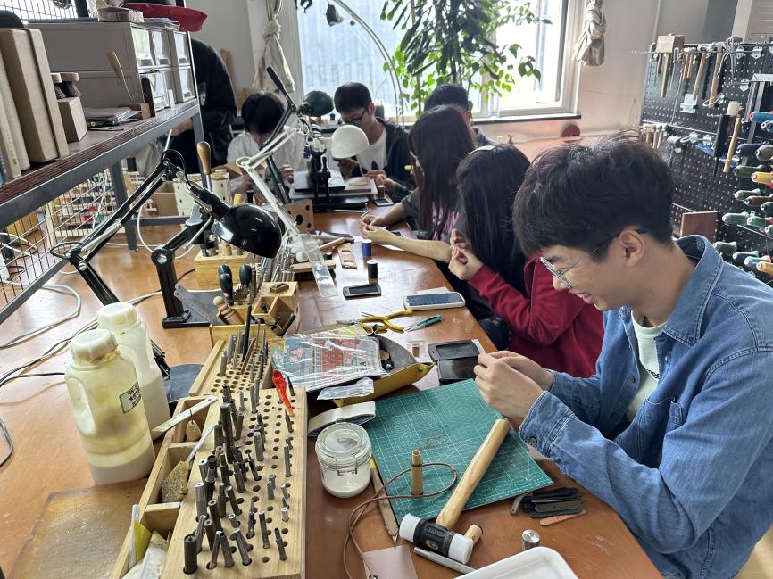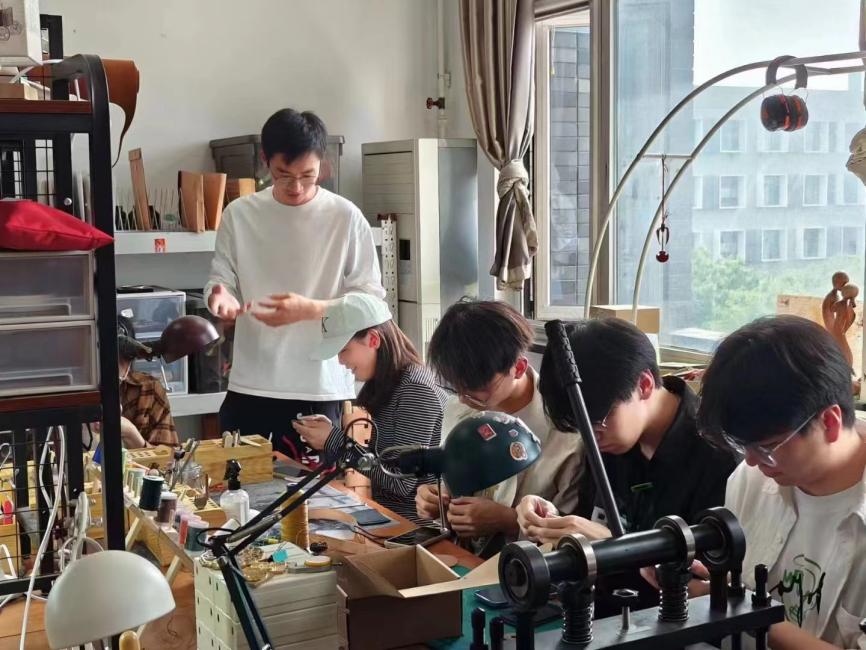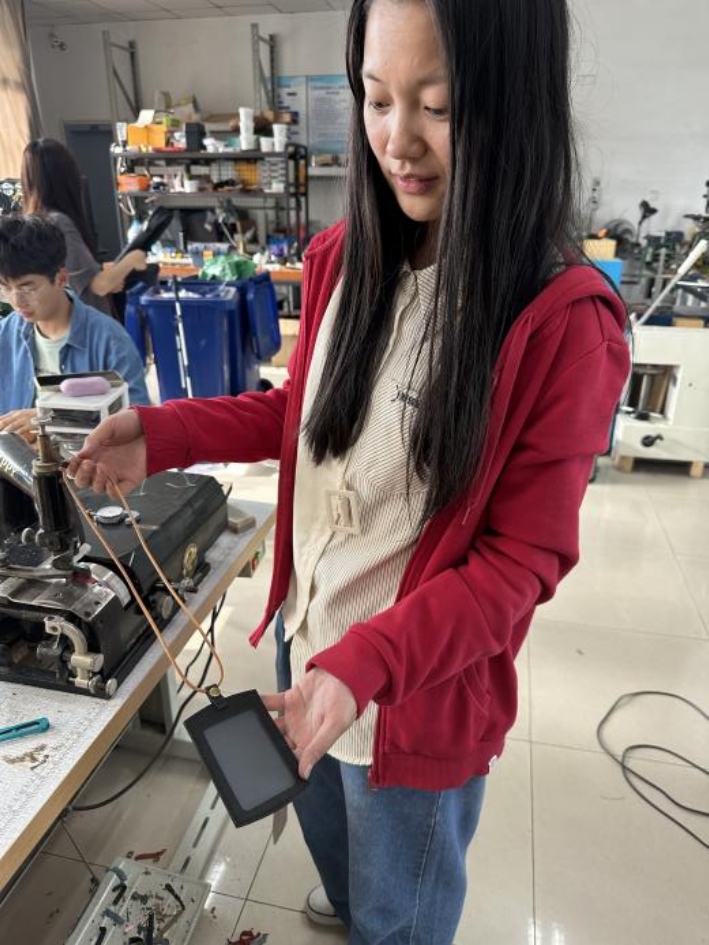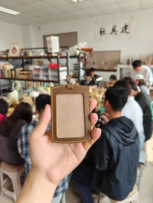 指导老师为大家发放牛皮、针和绣线等手工材料。在老师的指导下,大家纷纷化身手工匠人,一针一线的缝制,一丝不苟的打磨,并最后制作完成了卡包。
