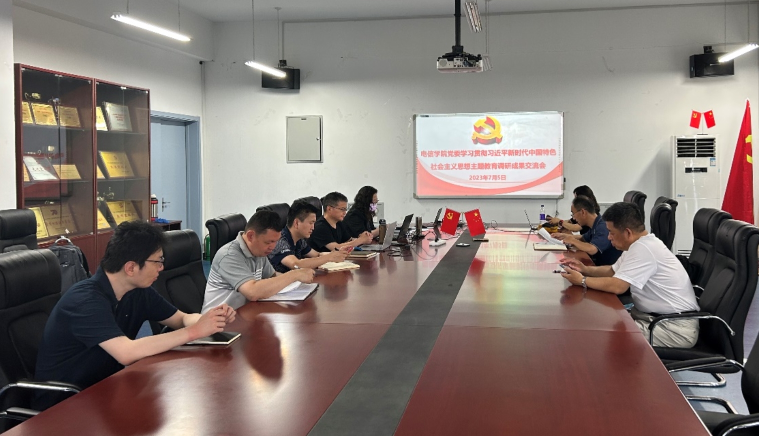 7月5日上午,电信扑克王下载 党委书记李云山主持召开学习贯彻习近平新时代中国特色社会主义思想主题教育调研成果交流会,扑克王下载 党政班子成员、各系主任、教工党支部书记参加会议。