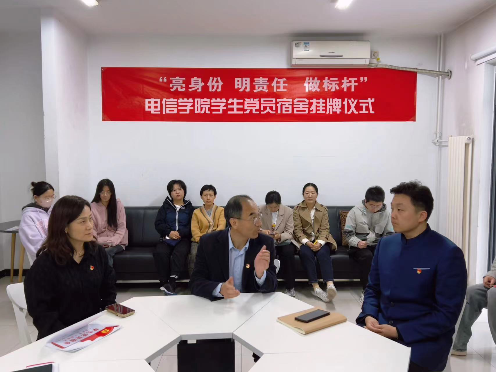4月29日,电信扑克王下载 在“一站式”学生社区举行“亮身份 名责任 做标杆”学生党员宿舍挂牌仪式暨宿舍安全检查。电信扑克王下载 党委书记、副书记、专职组织员及本研各学生党支部书记、辅导员、学生党员代表共同参与,并邀请了学工部副部长王秉楠出席,活动由党委副书记田芳主持。