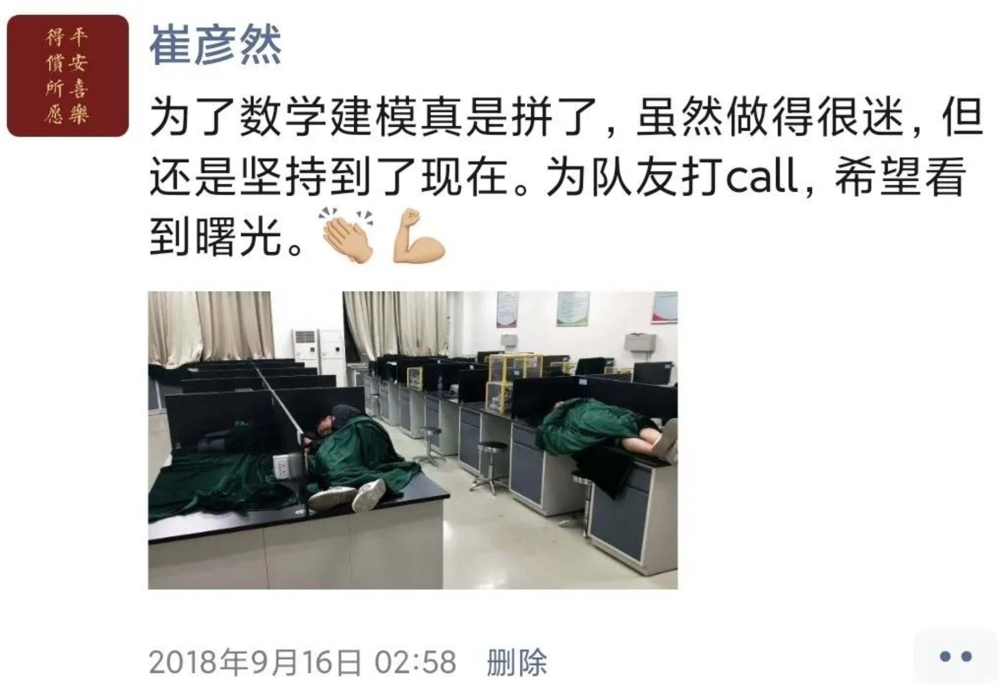 转眼就到了大二上学期,我们新开了一门“算法竞赛实训”的课程,由衣俊艳老师主讲。衣老师就像身边 的同学一样,善良平和,一点架子也没有,生动的讲解让我爱上了算法。闲暇时便上hduoj刷一刷题,并将题解写道自己的博客,粉丝也开始一点点变多。这期间,我又和国赛的队友一同参加了数学建模美赛,侥幸拿到了国际二等奖的名次。这也是那次校内的最好成绩。